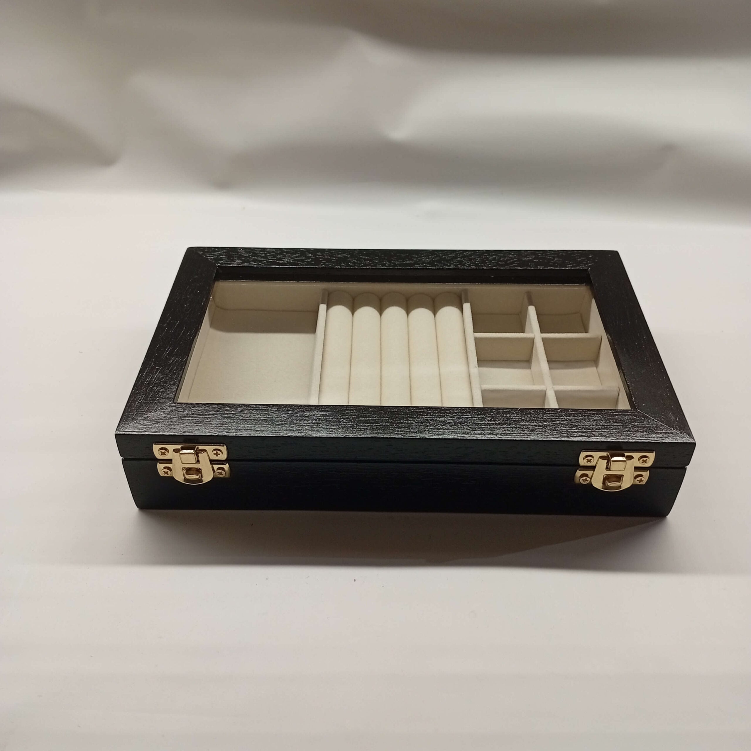 🤍 Organizza e proteggi tutti i tuoi preziosi con eleganza contemporanea grazie a questo cofanetto multiuso in legno nero massello con interno in velluto bianco panna suddiviso in 3 pratici scomparti.
